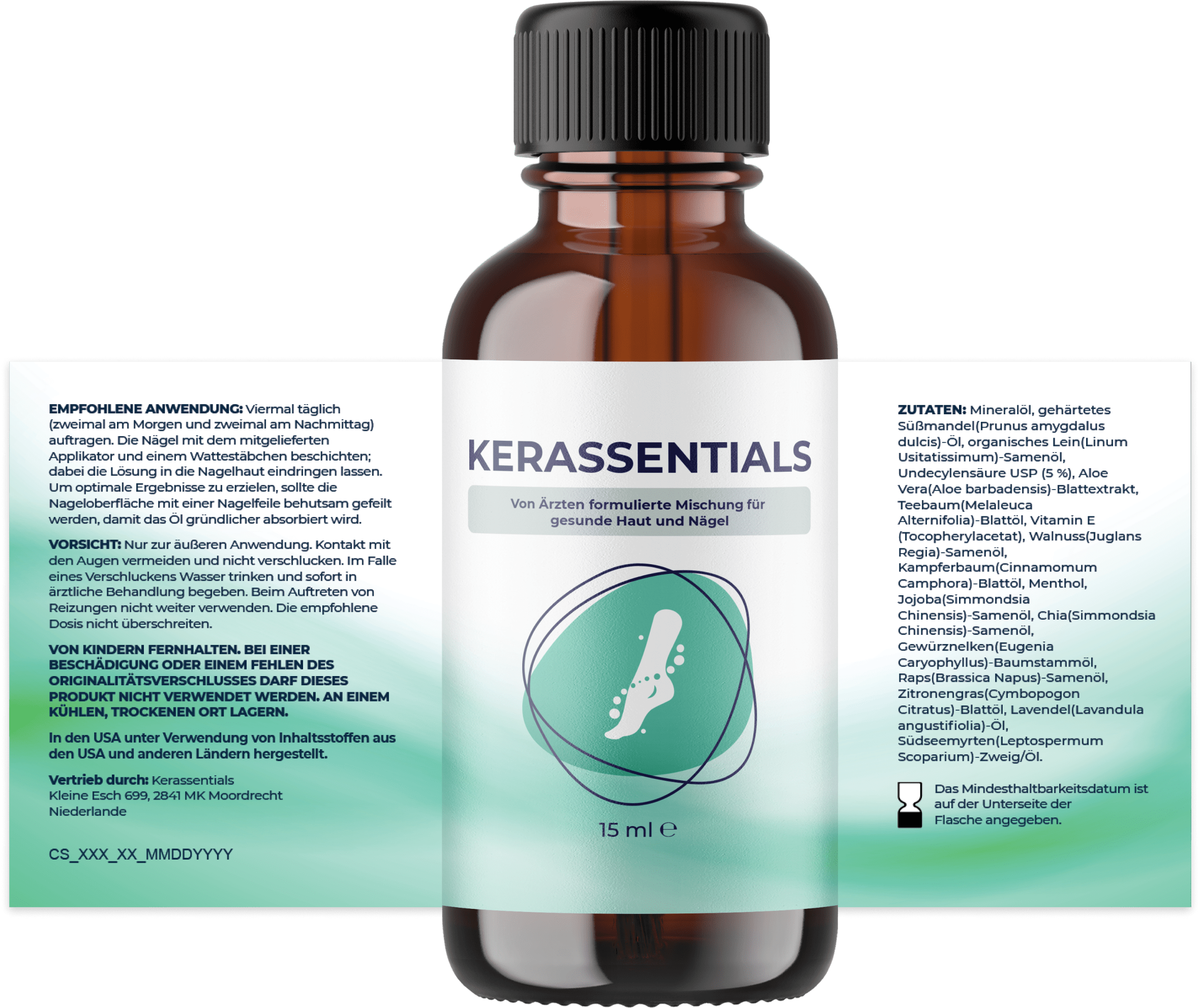 Kerassentials ist eine extrem wirksame Kombination aus Ölen und hautpflegenden Vitaminen, die du jeden Tag nach dem Duschen auftragen kannst, um deinem Nagelbett den nötigen Schub zu geben.